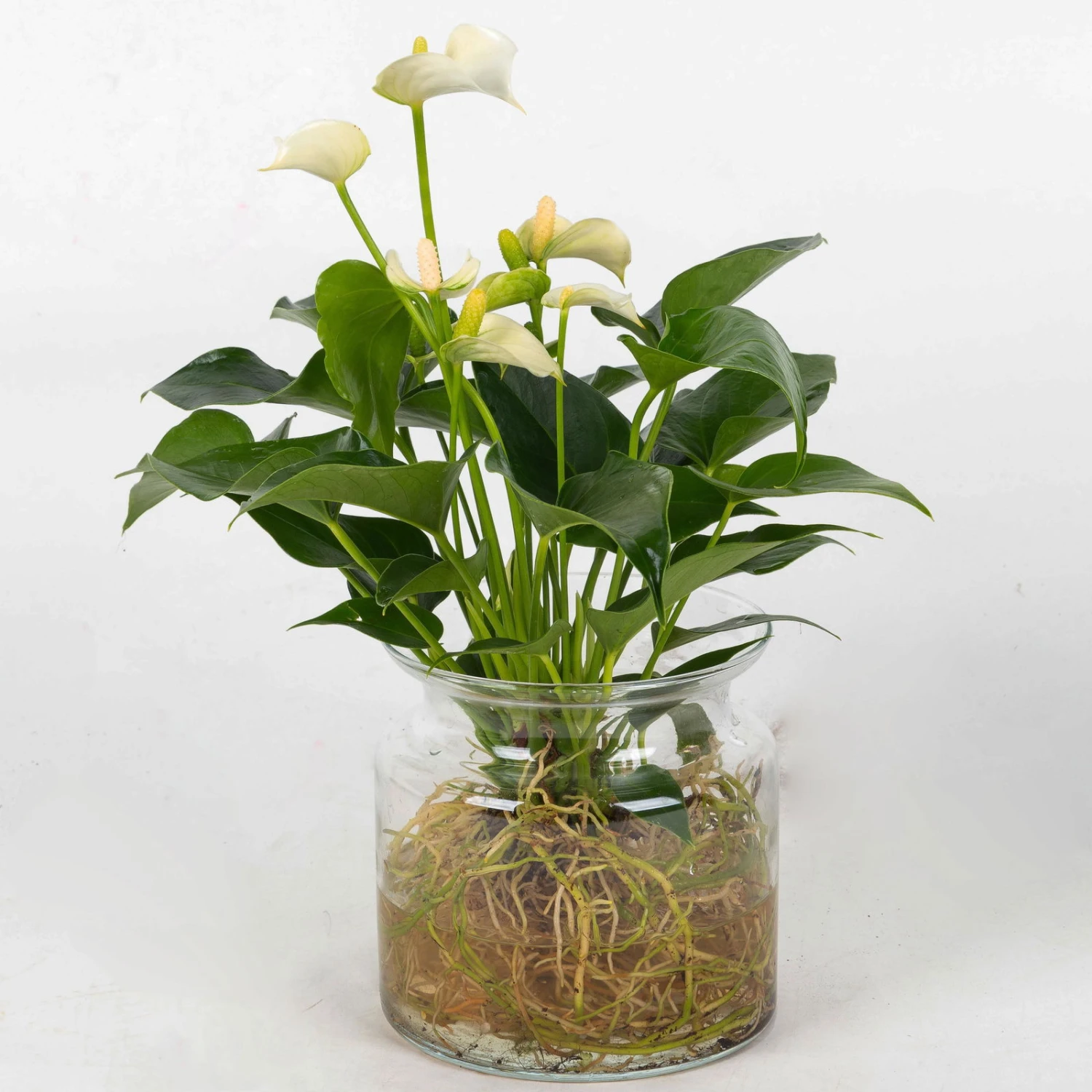 Mit dieser exklusiven Pflanzenschönheit holen Sie sich einen ganz besonderen Eyecatcher nach Hause: Diese exotische Flamingoblume, botanisch Anthurium genannt, kommt ganz ohne Erde aus und gedeiht ausschließlich in Wasser. In Kombination mit den weißen, lackartigen Hüllblättern der Blüten und den glänzenden, lanzettlichen Blättern ziehen die freigelegten Wurzeln in der modernen Glasvase alle Blicke auf sich! Aber auch als Geschenk ist diese Rarität für jeden Zimmergärtner eine schöne Idee.