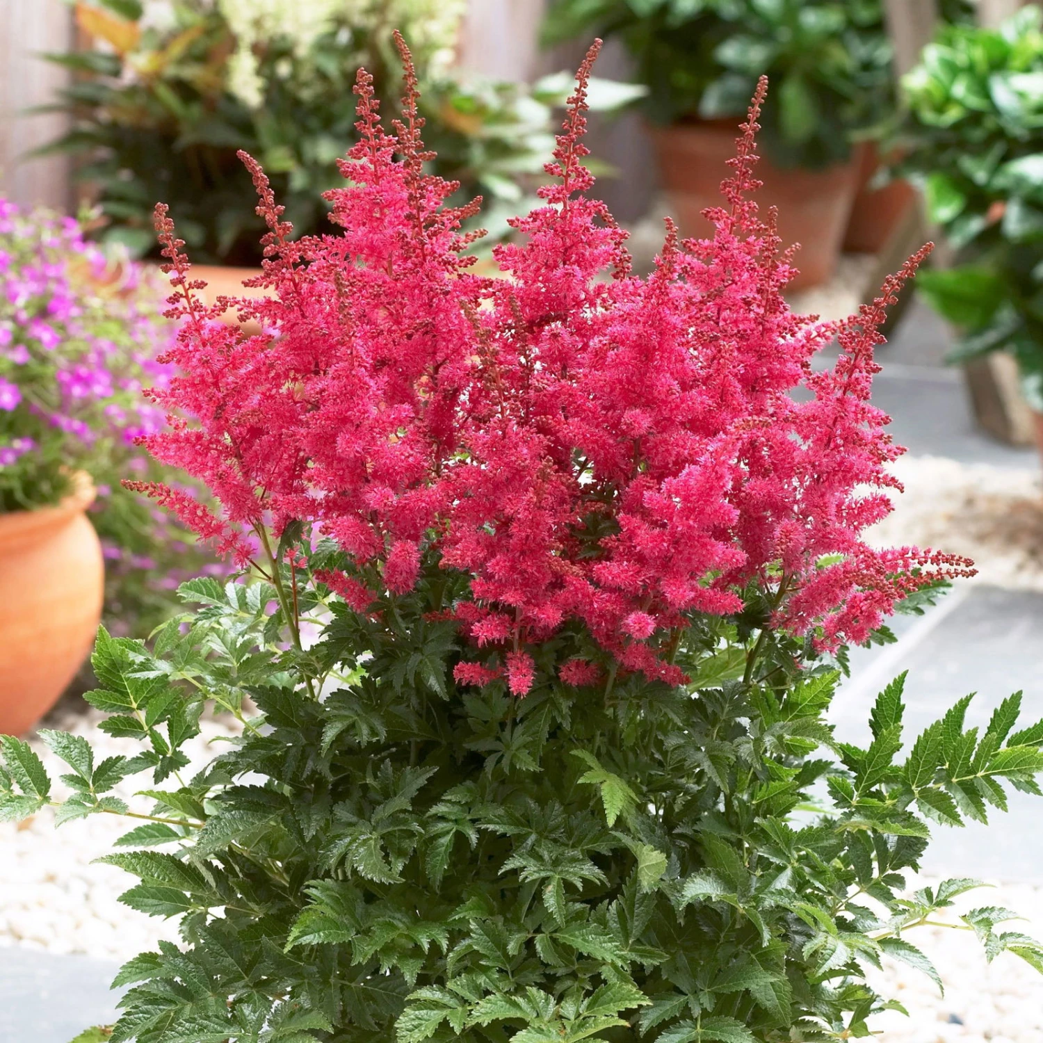 Bringen Sie mit den karminrosa blühenden Astilben, Astilbe japonica ‚Younique Cerise’® Leichtigkeit und den Zauber des Sommers in Ihr Staudenbeet. Die Astilbe japonica ‚Younique Cerise’® hat eine Wuchshöhe von 30 – 40 cm. Werden die prächtigen Stauden flächig in Gruppen von 3-5 Pflanzen gepflanzt, entsteht eine einzigartige Wirkung, die den Garten gleich nochmal so schön erscheinen lässt.