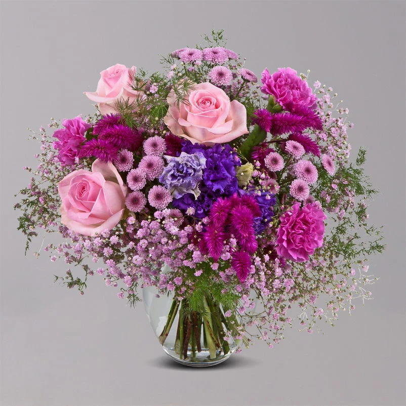 Das Herzstück dieser gelungenen Liaison in Rosa und Pink (Ø ca. 28 cm) bilden drei zartrosafarbene Rosen, die im perfekten Kontrast zu jeweils drei kräftig pinken Nelken und rosafarbenen, verzweigten Chrysanthemen stehen. Ergänzt wird das zuckersüße Prachtstück mit zwei lilafarbenen, gefüllten Lisianthus und drei Celosien. Rosa Schleierkraut umschmeichelt das floristische Meisterwerk und bildet in Verbindung mit Asparagus das Sahnehäubchen auf diesem Sommerboten.