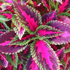 Die keilförmigen, gekerbten Blätter der Buntnessel (Solenostemon scutellarioides “Ruby Road‘), früher auch Coleus blumei genannt, begeistern mit ihrer pinken Mitte, die zunächst von Dunkelviolett/Dunkelrot umrandet und anschließend in Hellgrün eingefasst ist. Zur Nomenklatur kann auch der Gattungsname Plectranthus verwendet werden. Die Buntnessel kann eine Wuchshöhezwischen 20 und 60 cm erreichen.
