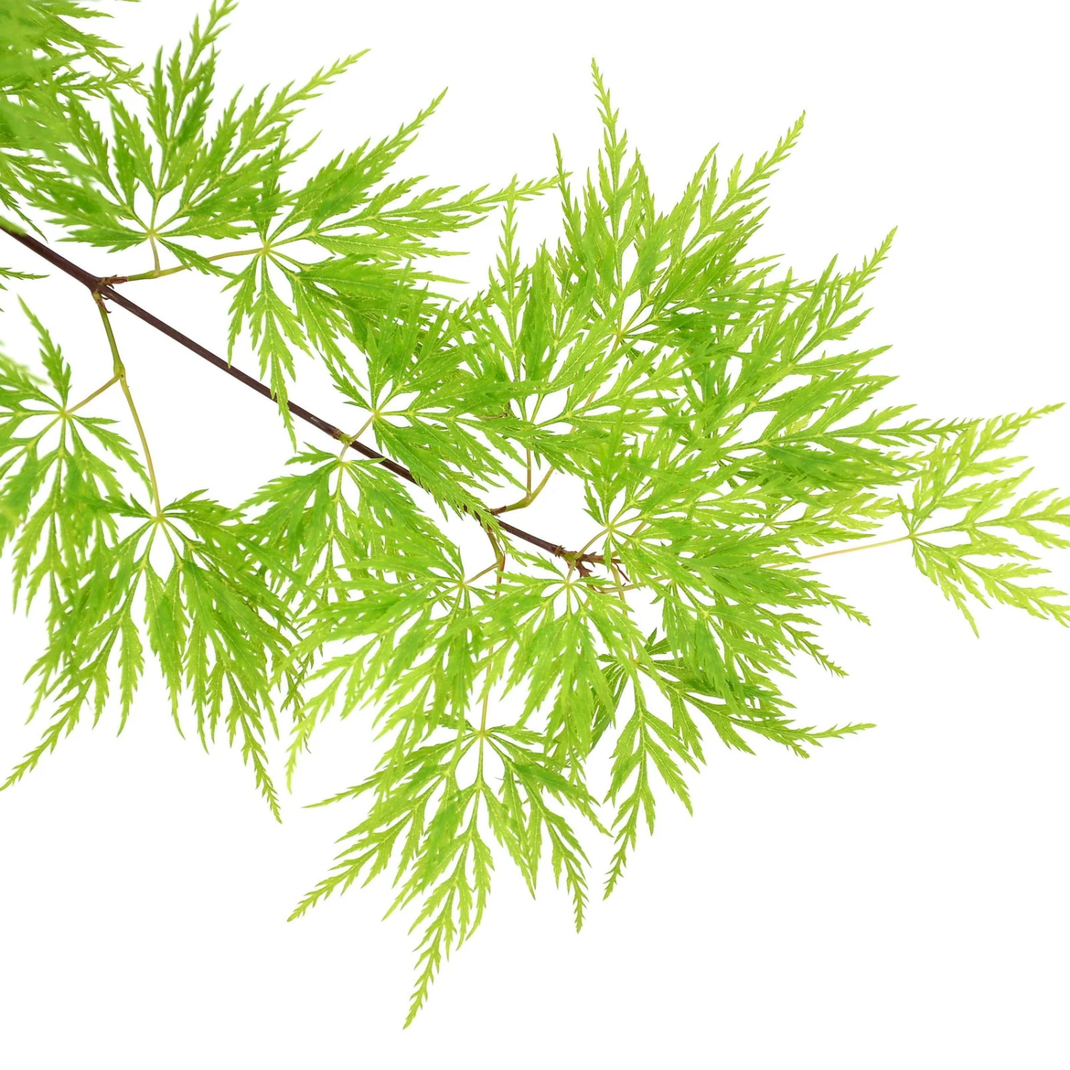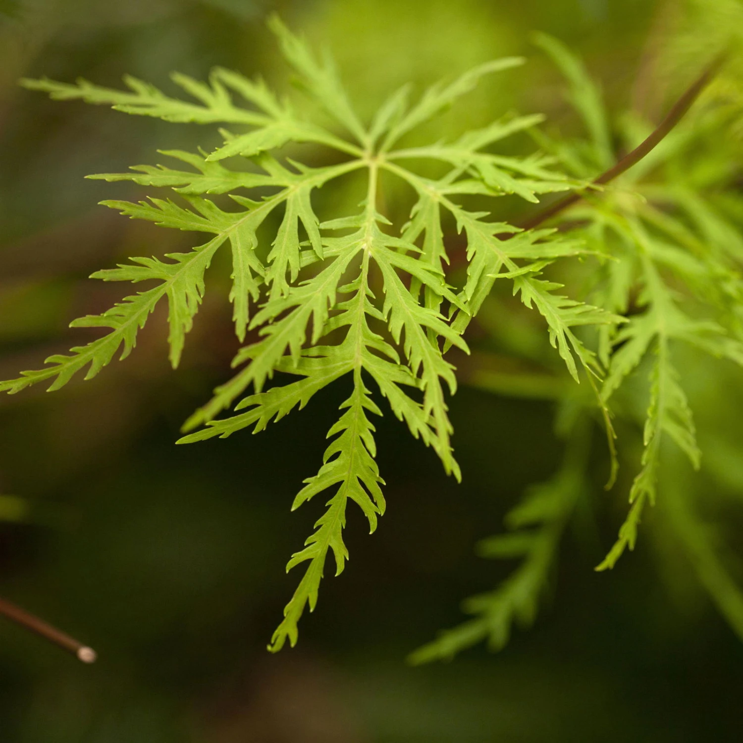 Der Fächerahorn Acer palmatum ‚Emerald Lace‘ sorgt das ganze Jahr für Abwechslung in Ihrem Garten. Im Frühjahr zeigen sich die fein geschlitzten Blätter zunächst in einem gelbgrünen Farbton. Im Sommer werden die Blätter dann dunkelgrün und im Herbst erstrahlen sie leuchtend rot. Der Acer erreicht eine Wuchshöhe von bis zu 250 cm und eine Breite von 300 – 350 cm. Die Pflanze fühlt sich an einem sonnigen bis halbschattigen Standort wohl. Lange Triebe können für einen dichten Wuchs im März geschnitten werden. Pflanzen im Topf, dort speziell der Wurzelbereich, müssen im Winter geschützt werden. Ansonsten ist der Ahorn gut winterhart.