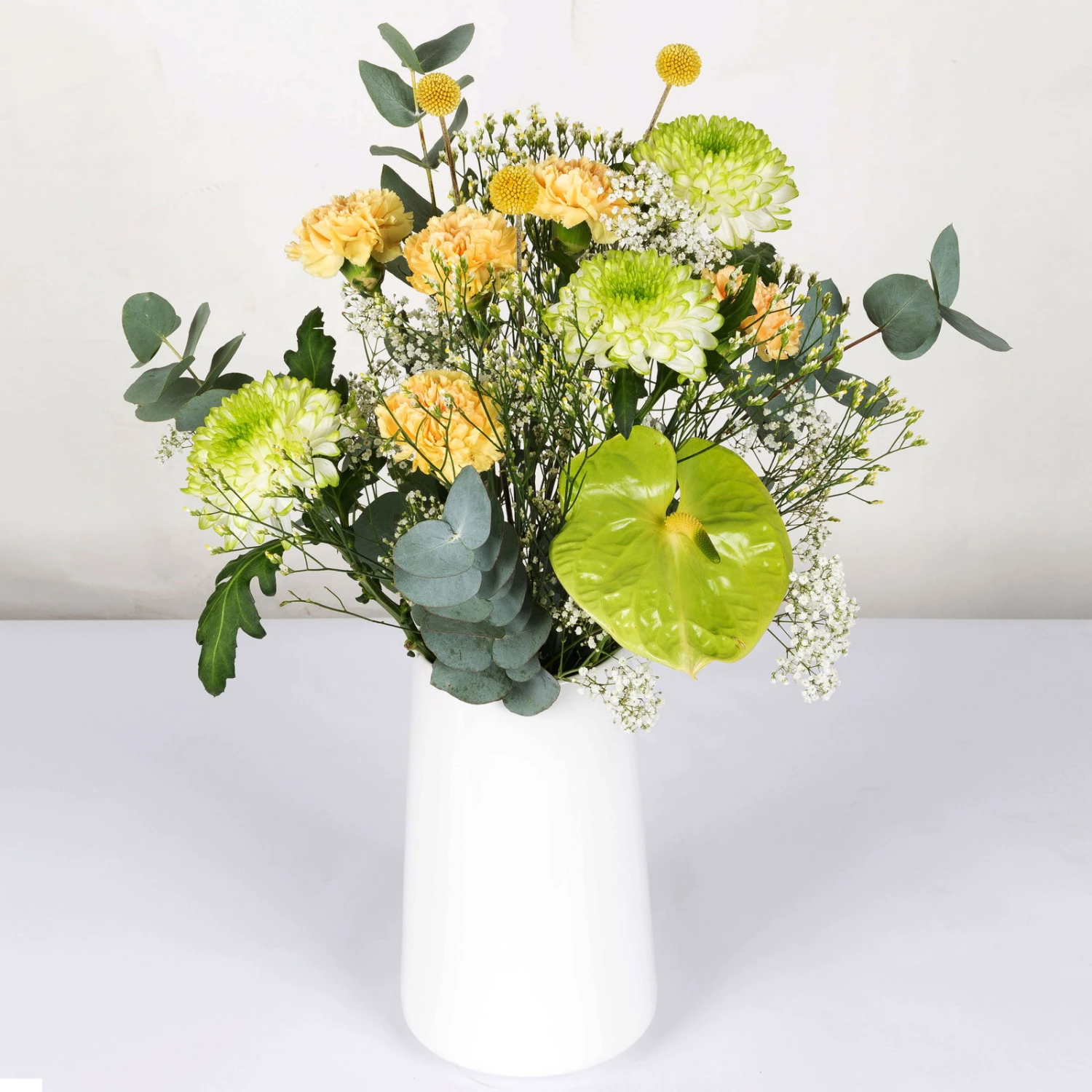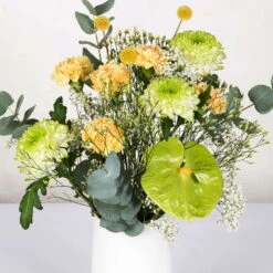 Das DIY-Bund ‚Grüne Schönheit‘ besteht aus limonengrünen Chrysanthemen und Anthurien, die von feinem Schleierkraut und Strandflieder, Eukalyptus, Nelken und Craspedia begleitet werden. Unsere Schnittblumen werden im Karton liegend mit einem wasserspeichernden Umschlag im unteren Stielbereich geliefert, so dass sie den Transport unbeschadet überstehen. Egal ob als Strauß oder Gesteck – Vor dem Verarbeiten die Stiele frisch anschneiden und mit frischem Wasser, in das Sie vorher das beigefügte Blumenfrisch gegeben haben, versorgen. Dann steht Ihrer Kreativität nichts mehr im Wege!