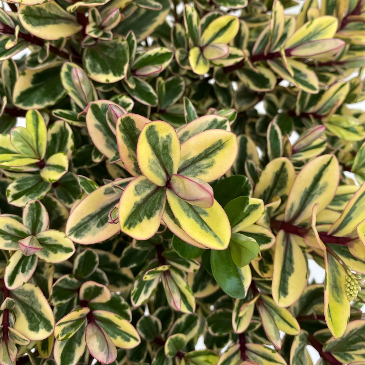 Die großen, buntlaubigen, lang gestreckten Blätter der Strauchveronika (Hebe andersonii Addenda®) überzeugen in einem Mix aus 3 Farben. Die Pflanze wächst aufrecht und buschig. Die Strauchveronika kann eine Wuchshöhe von 40 bis 60 cm erreichen und auch entsprechend breit werden.