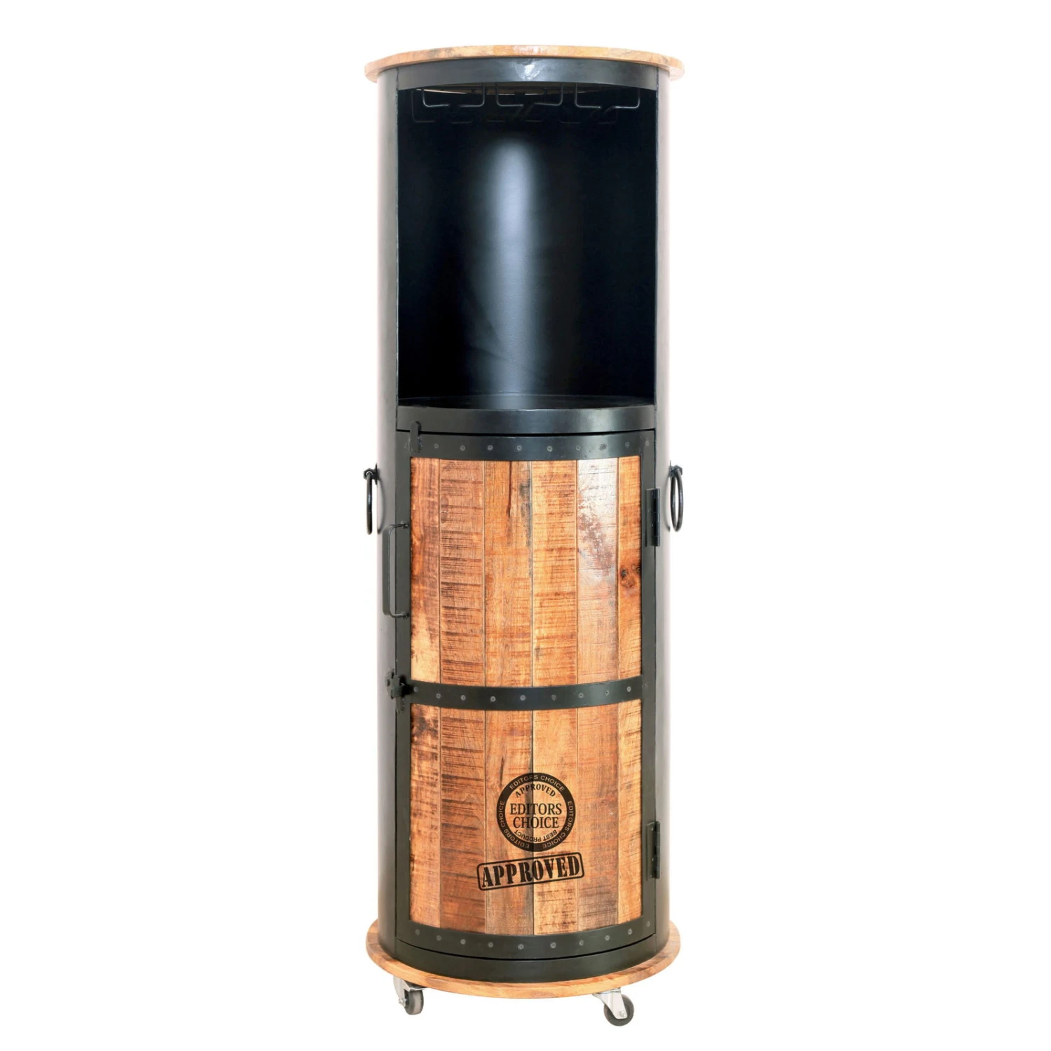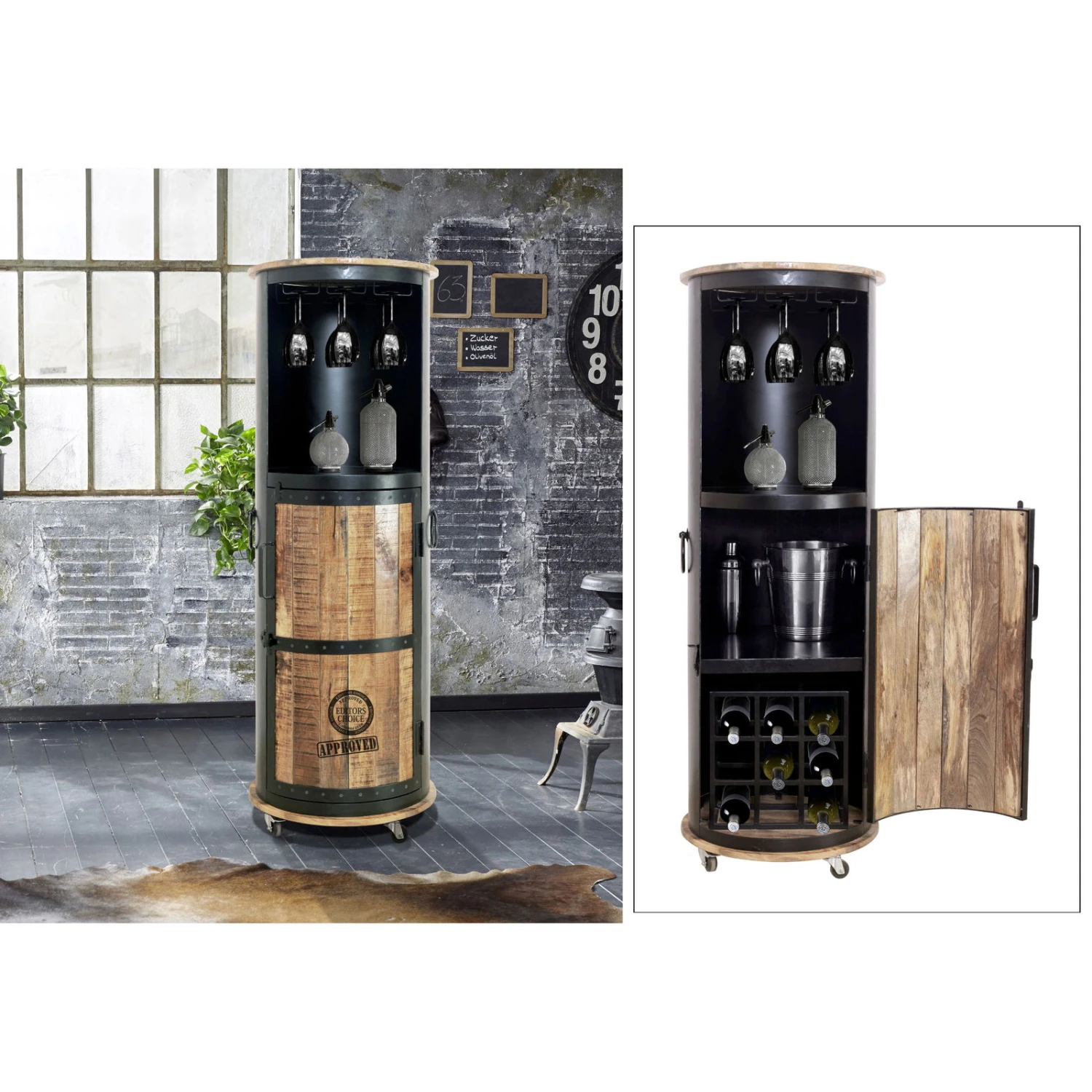 Die IRON Bar ist stets zur Hand und bietet Ihnen eine mobile Aufbewahrungsmöglichkeit für Getränke. Die Bar begeistert durch den angesagten Industrial-Look in der Kombination aus Mangoholz und Eisen. In der Bar IRON ist Platz für neun Flaschen sowie für Gläser und Zubehör. Dieses stylische Wohnaccessoire eignet sich ausschließlich für den Innenbereich.