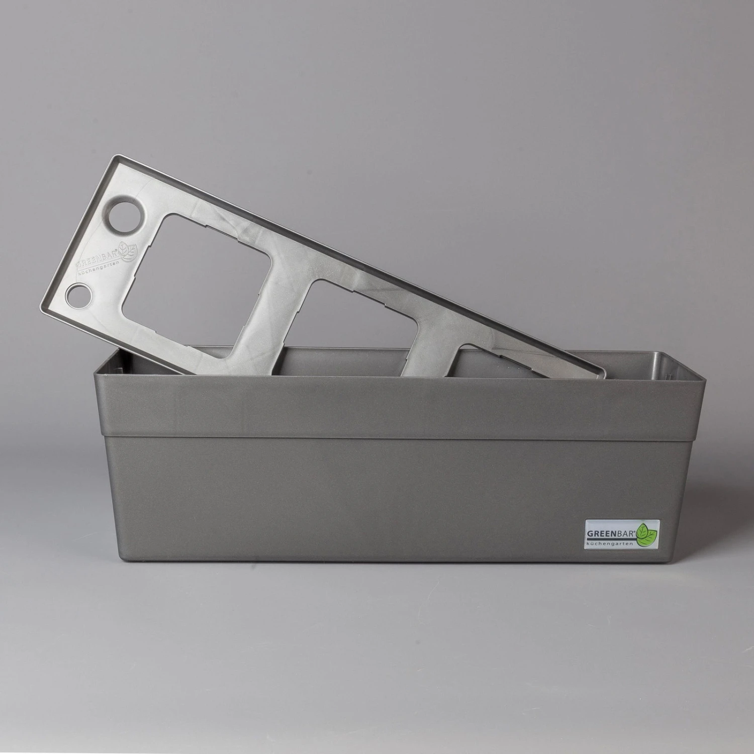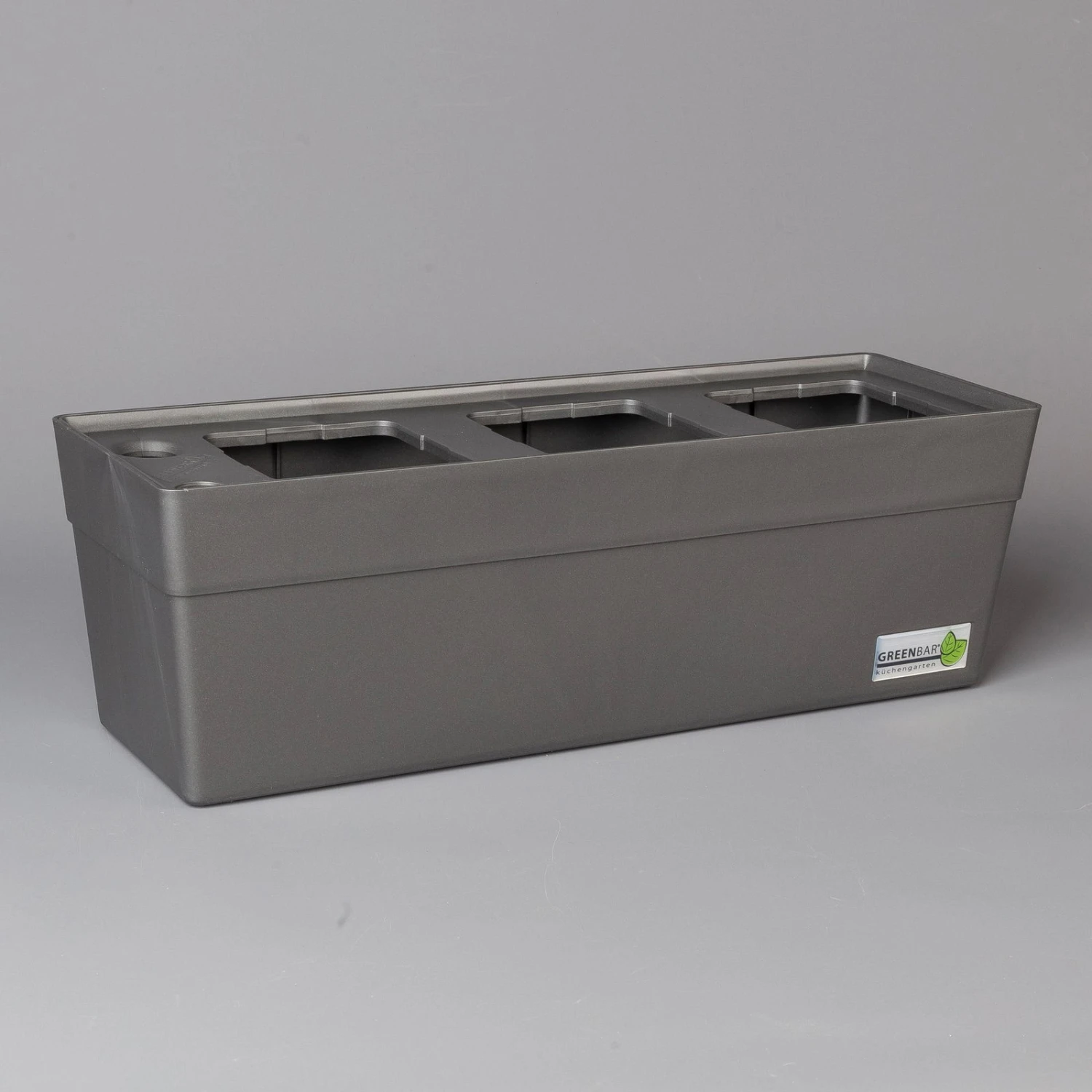 Die Greenbar® ermöglicht eine äußerst pflegeleichte Kultur verschiedenster Gemüsepflanzen und Kräuter. Über ein integriertes Bewässerungssystem werden sie mit der optimalen Menge an Wasser und Nährstoffen versorgt. Die Pflanztöpfe werden hierzu auf ein spezielles Bewässerungsvlies in die Greenbar® gestellt und der Wasserhaushalt ganz einfach über ein Einfüllloch und eine Wasserstandsanzeige geregelt. Um Staunässe und eine Schädigung der Wurzeln zu vermeiden, sollte der Wasserstand nicht permanent genau zwischen ‚Min‘ und ‚Max‘ liegen, sonder eher in Zyklen zwischen Nass und Trocken oszillieren. Ein regelmäßiges Abtrocknen des Substrats ist förderlich, ein völliges Austrocknen hingegen nicht. Fällt der Wasserstand dauerhaft unter ‚Min‘, vertrocknen die Pflanzen und werden nicht mehr mit den nötigen Nährstoffen versorgt, überschreitet der Wasserstand ‚Max‘ für längere Zeit ist für die Pflanze nicht genug Sauerstoff verfügbar. Zum guten Gedeihen brauchen die Küchenkräuter in der Greenbar® lediglich einen sonnigen Standort drinnen oder draußen am Fenster, auf dem Balkon oder der Terrasse.