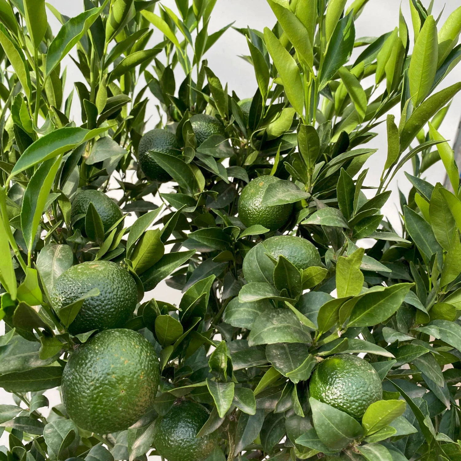Die länglich ovalen, vorne zugespitzten Blätter des Mandarinenbaumes (Citrus reticulata) begeistern das ganze Jahr über mit satt grüner Farbe. Das Mandarinenbäumchen wächst von Natur aus bei ausreichender Helligkeit kompakt und dicht buschig. Sollten es doch etwas locker wachsen, können Sie durch Rückschnitt die Verzweigung anregen und somit die Krone kompackter gestalten. Die mediterrane Kübelpflanze kann eine Wuchshöhe von 1,50 -2,50 Metern erreichen.