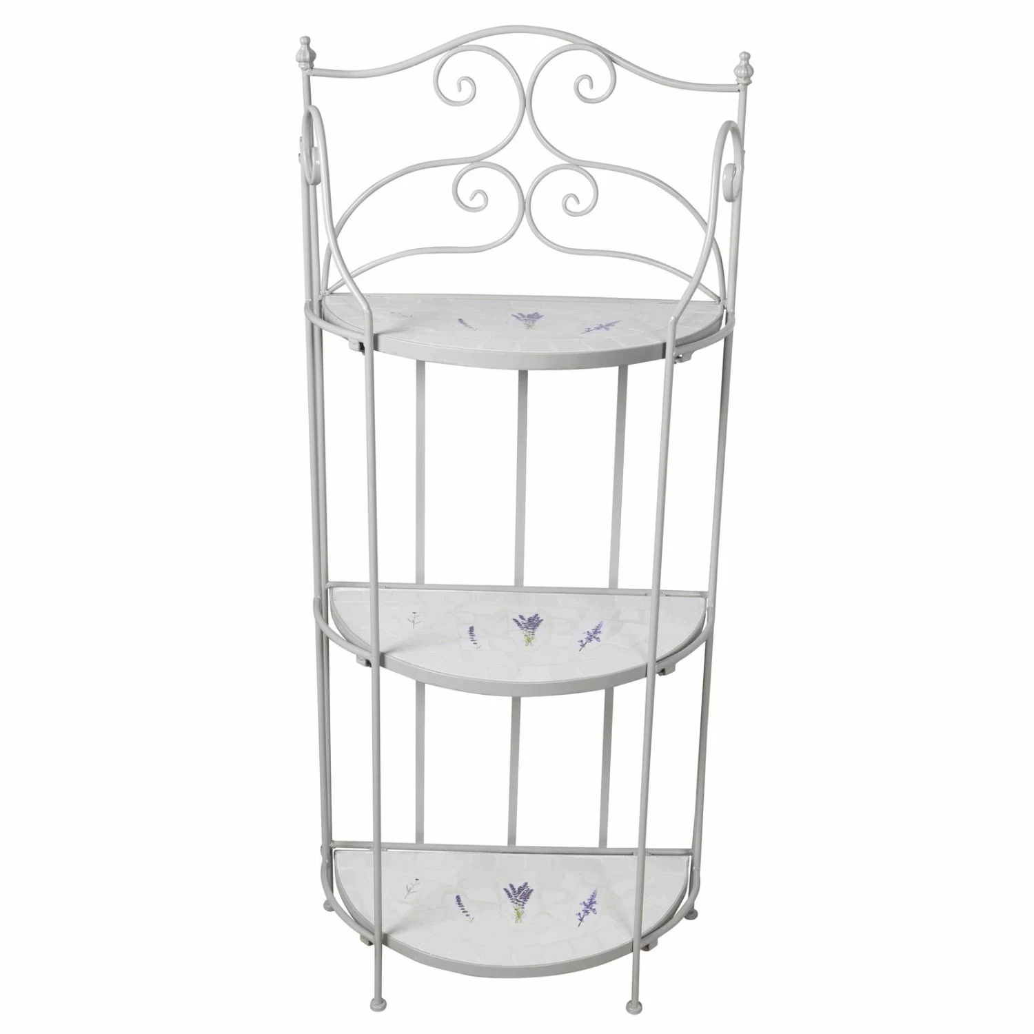 Dieses formschöne und funktionelle Pflanzregal avanciert im Outdoorbereich oder in Ihrem Wintergarten zu einem romantischen Hingucker. Das Regal Lille ist mit handgearbeiteten Lavendelfliesen aufwendig dekoriert, dabei ist jedes Möbelstück ein Unikat. Der gebogene Eisenrahmen verleiht dem Pflanzregal ein Plus an Stabilität. In einem rund 130 Zentimeter hohen Regal finden mehrere Pflanztöpfe und kleinere Kübel mit Ihren Lieblingsgewächsen Platz. Dazwischen lassen sich Figuren und Vasen gekonnt in Szene setzen. Beachten Sie bitte, dass das Mosaik-Regal Lille am besten in überdachten Räumen zu nutzen ist. Befreien Sie das Regal von Verunreinigungen mit einem weichen, feuchten Putztuch und nutzen Sie nur schonende Reinigungsmittel.