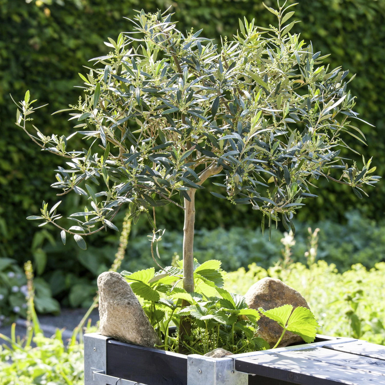 Die Olive (Olea europaea) überzeugt mit ihren charakteristisch grün und silbergrauen, schmalen Blättern und der silbrig anmutenden Rinde. Die Blätter stehen wechselständig an kurzen Stielen. Die Olive, auch Ölbaum genannt, stammt ursprünglich aus dem Mittelmeerraum und ist seit Tausenden Jahren als Nutz- und Symbolpflanze bekannt. Die mediterrane Pflanze wächst sehr langsam und kann sich am Naturstandort zu beeindruckenden Bäumen von bis zu 20 Metern entwickeln. Im Kübel auf der Terrasse wird die Olive meist nicht größer als 2 Meter.