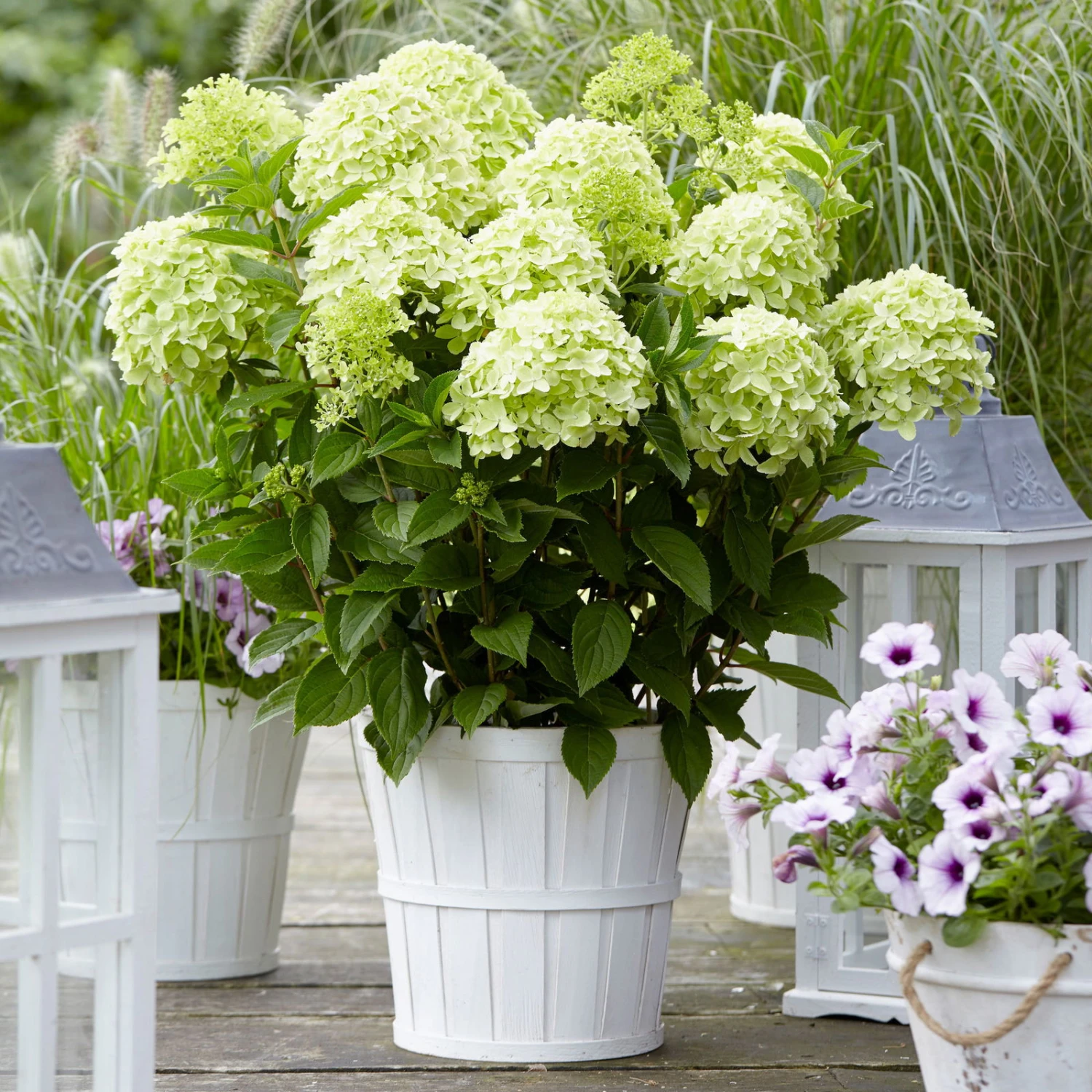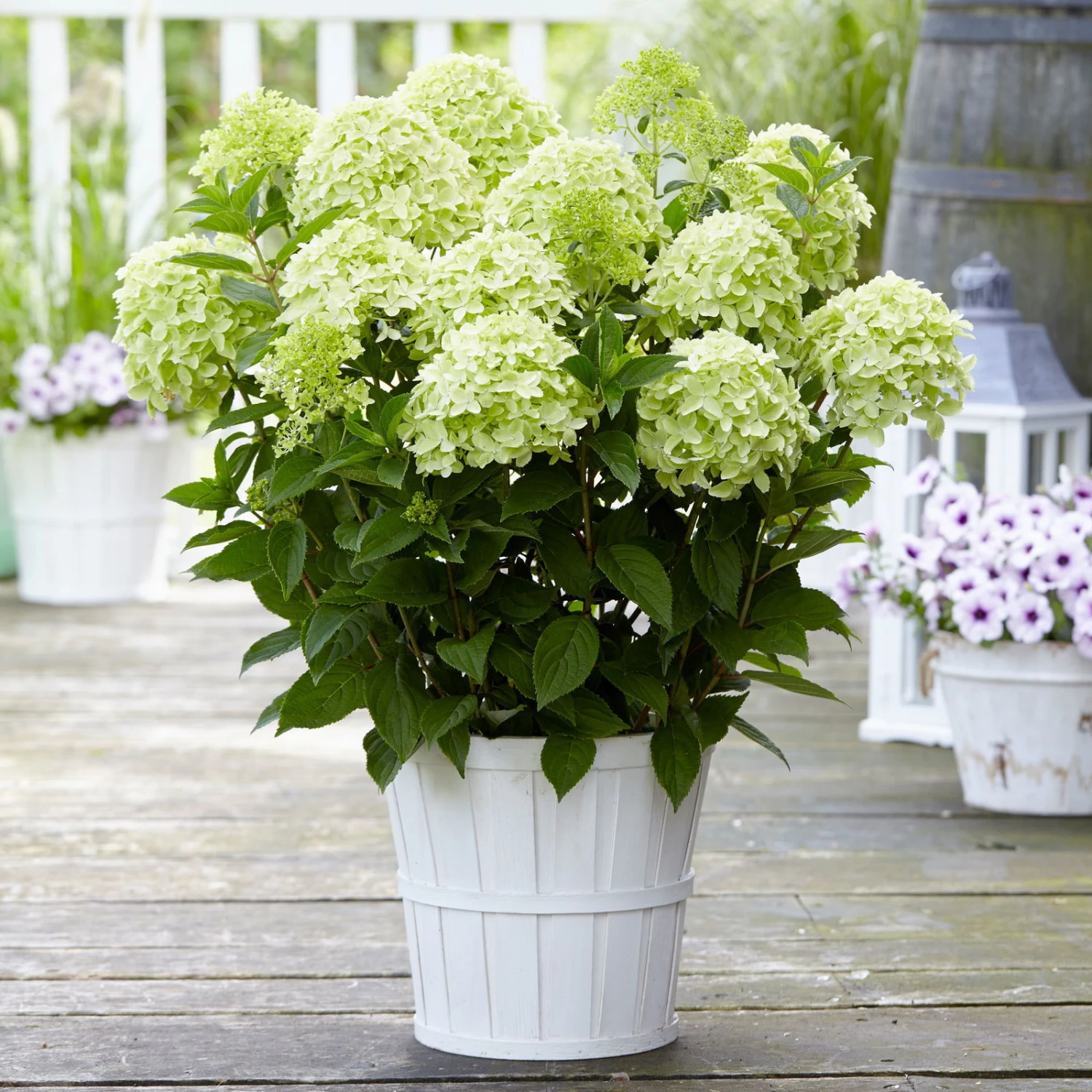 Die Rispenhortensie Hydrangea paniculate ‚Whitelight’® blüht zwischen Juli und September in herrlichem Cremeweiß, wobei sich die filigranen Blüten zum Schluss rosa verfärben. Ihre Rispenhortensie macht sich im Einzelstand, in Gruppen oder auch in Kübelkultur gleich hervorragend. Dieses Ziergehölz erreicht Wuchshöhen von bis zu 150 Zentimetern und fühlt sich in frischen Böden wohl. Tolle Neuheit auf dem Rispenhortensienmarkt! Sehr gut für den Kübel geeignet. Blüht am einjährigen Holz.
