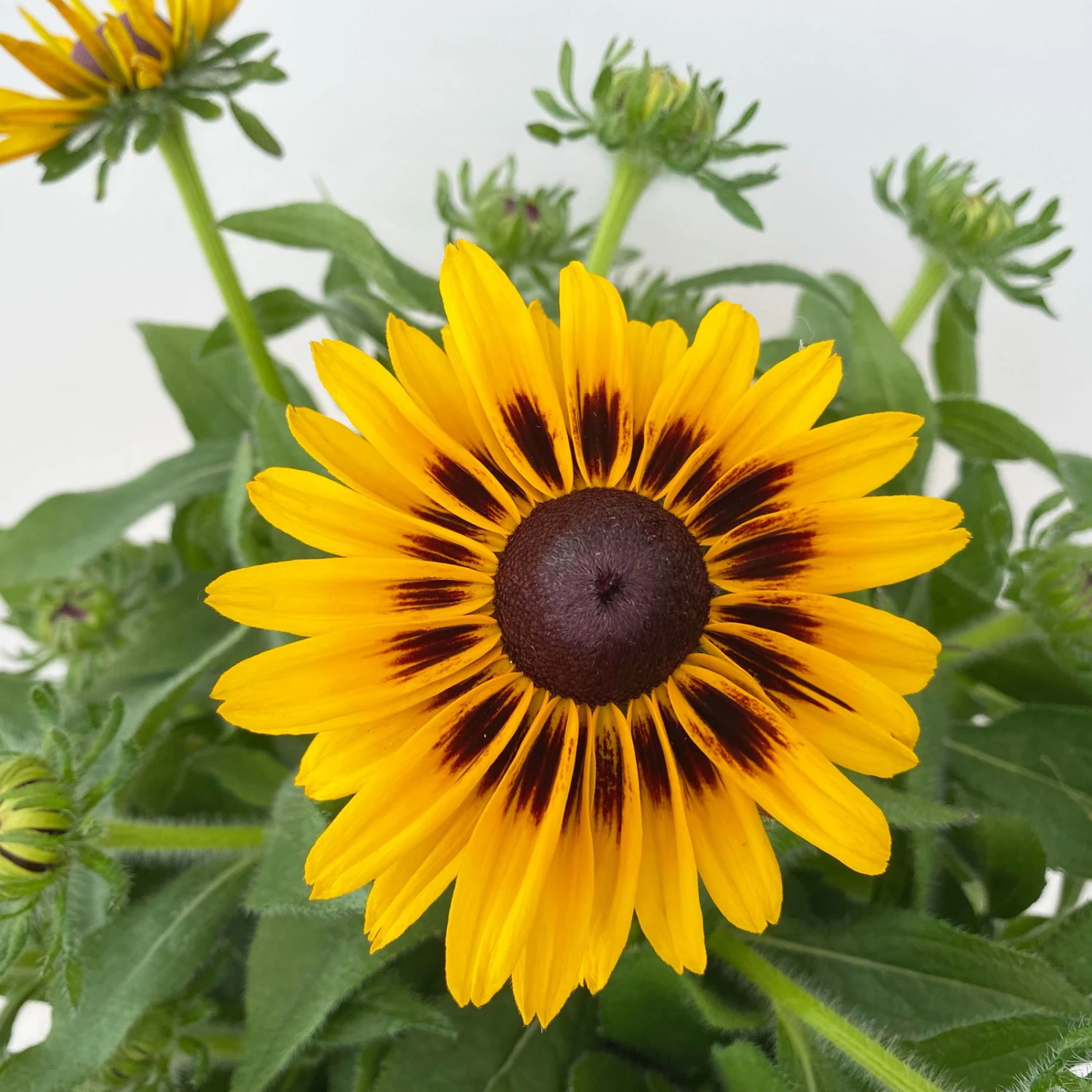 Die länglichen Blätter des Sonnenhuts (Rudbeckia hirta) haben eine rauhe Oberfläche und begeistern in saftigem Grün. Ursprünglich ist der Sonnenhut in Nordamerika beheimatet. Die einjährige Rudbeckia wächst buschig aufrecht und kann eine Wuchshöhe von 80 bis 100 cm erreicht werden.